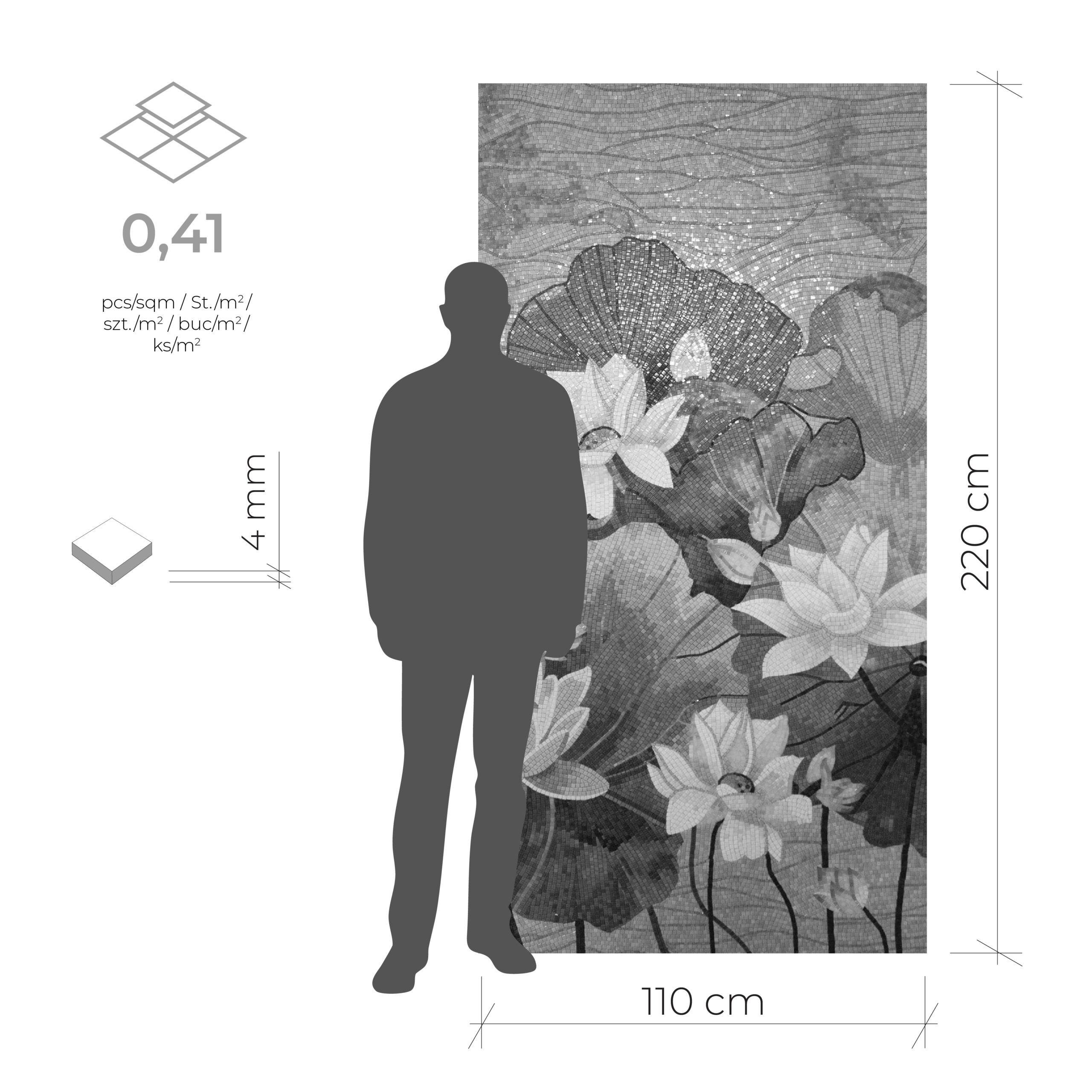 Mozaika wykonana w stylu artystycznym, wykorzystując dopasowane, precyzyjnie przycięte elementy. Cała kompozycja tworzy realistyczny obraz, przedstawiający kwitnące lilie w kolorach bieli. Mozaika o wymiarach 110×220 cm doskonale nada się jako dekoracja ścienna do każdego wnętrza. Dzięki właściwościom szkła, które nie pochłania wody, mozaika świetnie sprawdzi się w takich pomieszczeniach jak kuchnia czy łazienka.