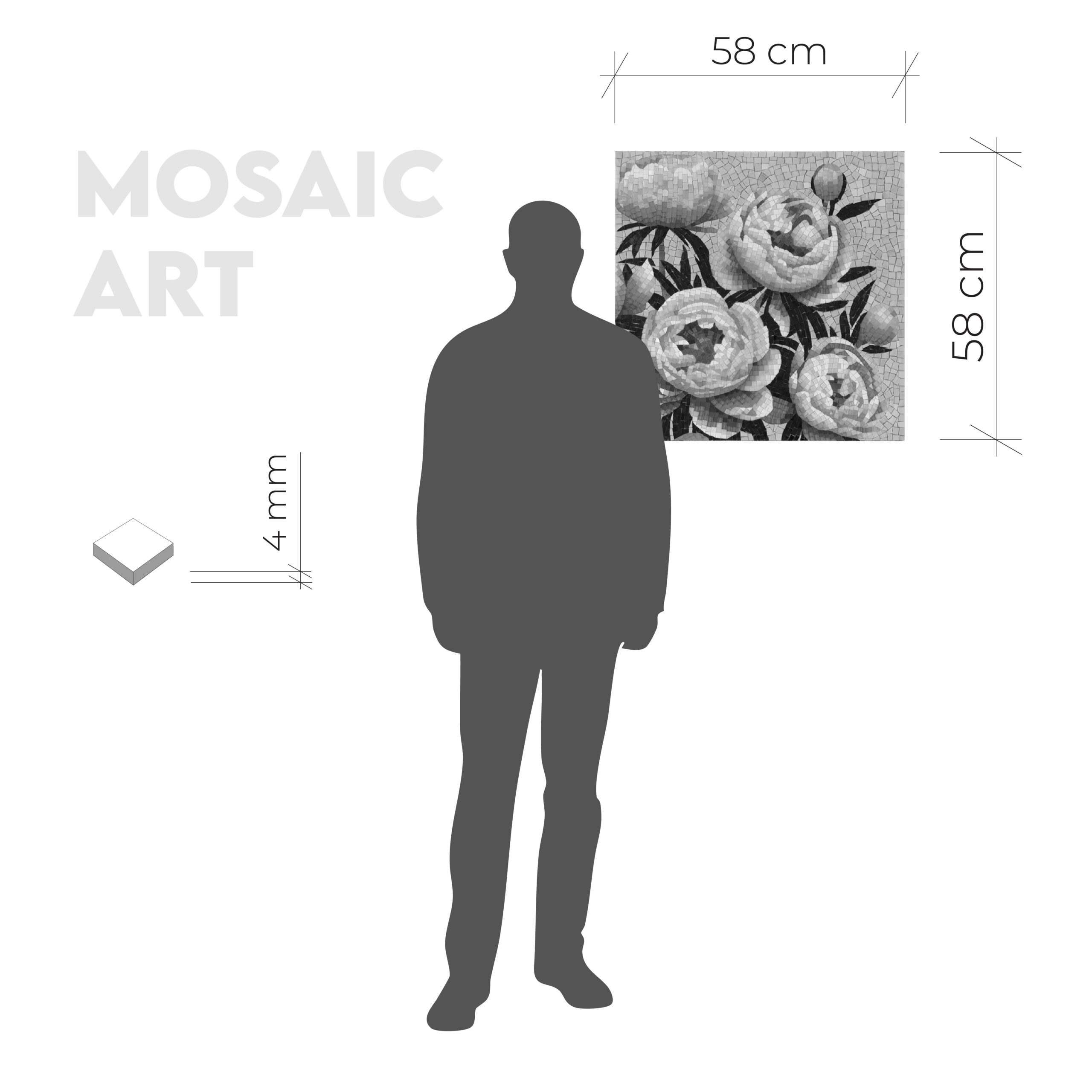 Mozaika wykonana w stylu artystycznym, wykorzystując dopasowane, precyzyjnie przycięte elementy. Obraz przedstawia rozkwitnięte, różowe piwonie na niebieskim tle. Cała kompozycja tworzy realistyczny obraz o wymiarach 58×58 cm, co sprawia, że doskonale nadaje się jako dekoracja ścienna do każdego wnętrza. Dzięki właściwościom szkła, które nie pochłania wody, mozaika świetnie sprawdzi się w takich pomieszczeniach jak kuchnia czy łazienka.