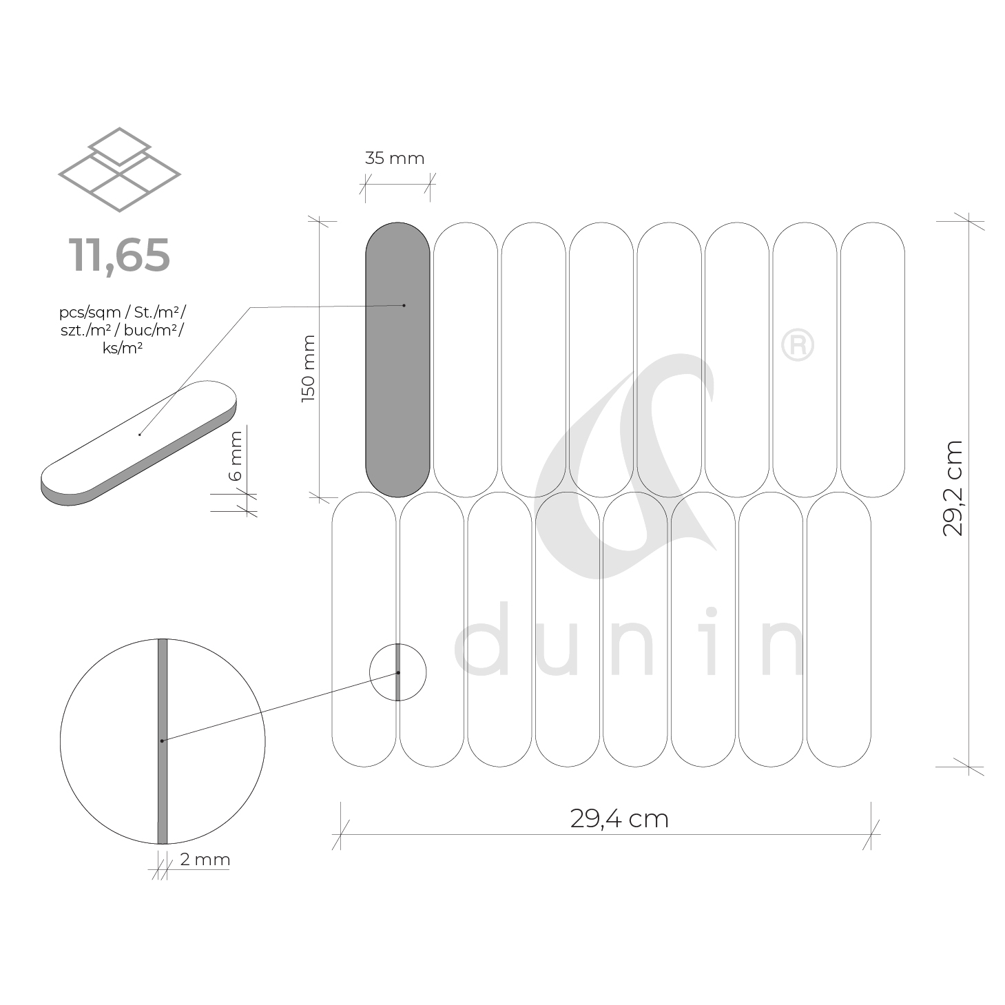 Każdy element ma wymiar 150 × 35 mm i jest ułożony na arkuszach 29,4 × 29,2 cm, co ułatwia szybki montaż i pozwala uzyskać równą powierzchnię nawet na większych ścianach. Gresowa konstrukcja gwarantuje trwałość, odporność na wilgoć i łatwą pielęgnację, dzięki czemu płytki te są idealne zarówno do łazienek, jak i do kuchni czy przestrzeni komercyjnych.