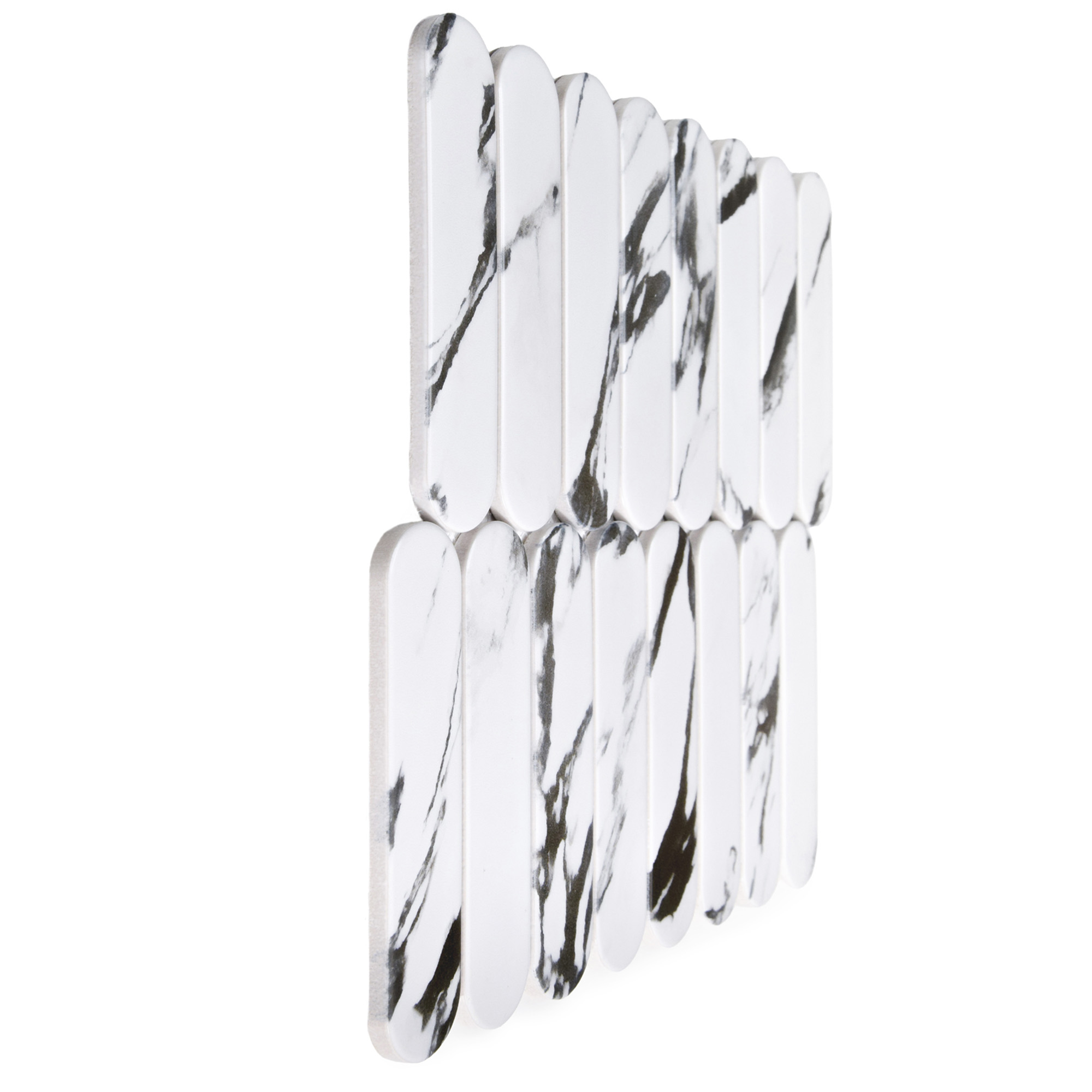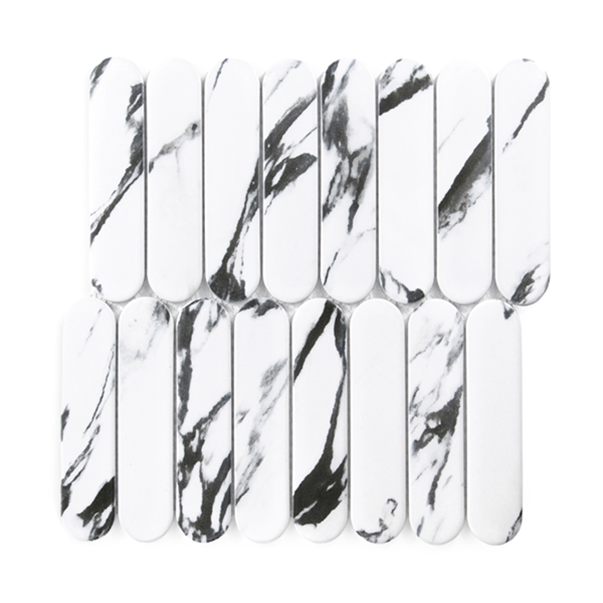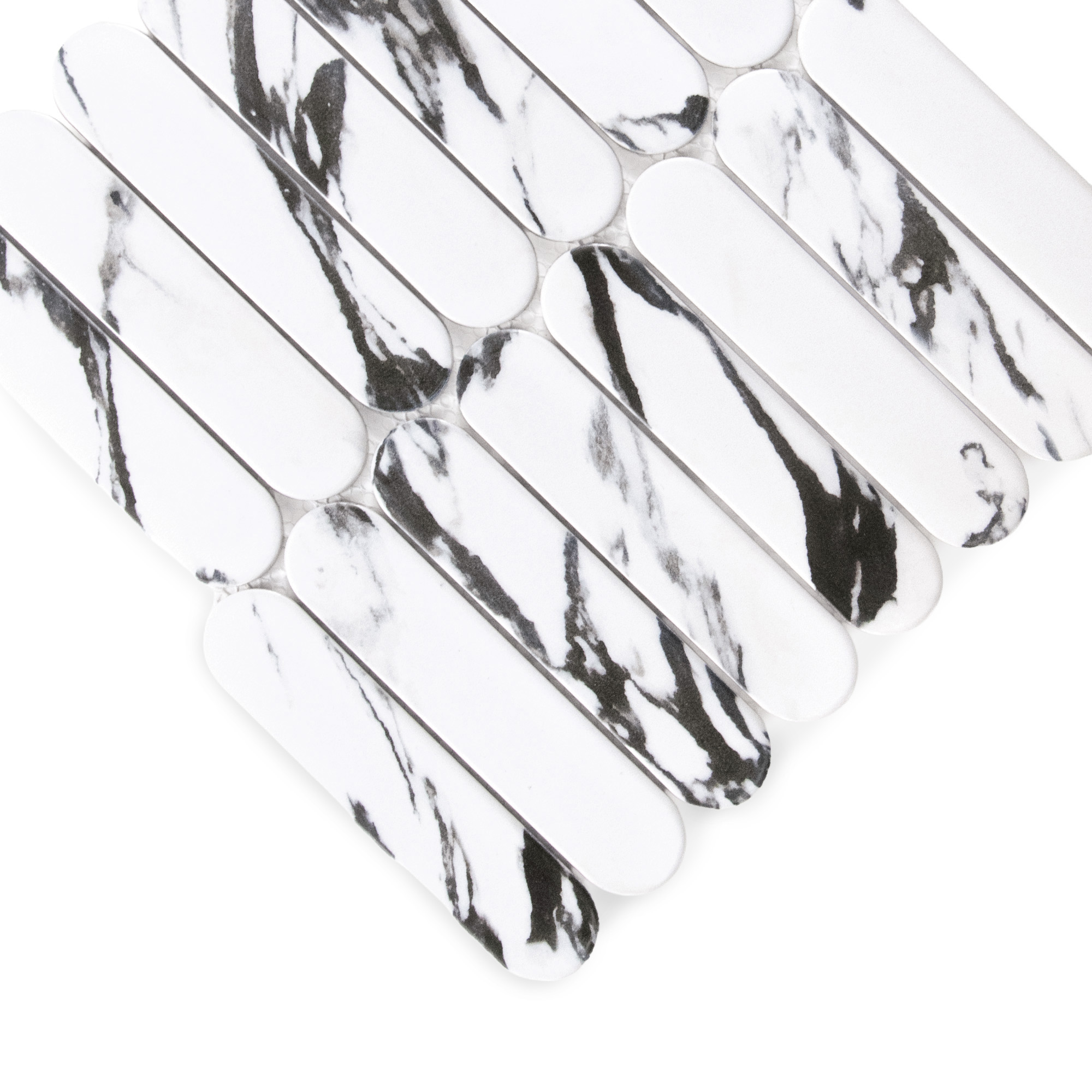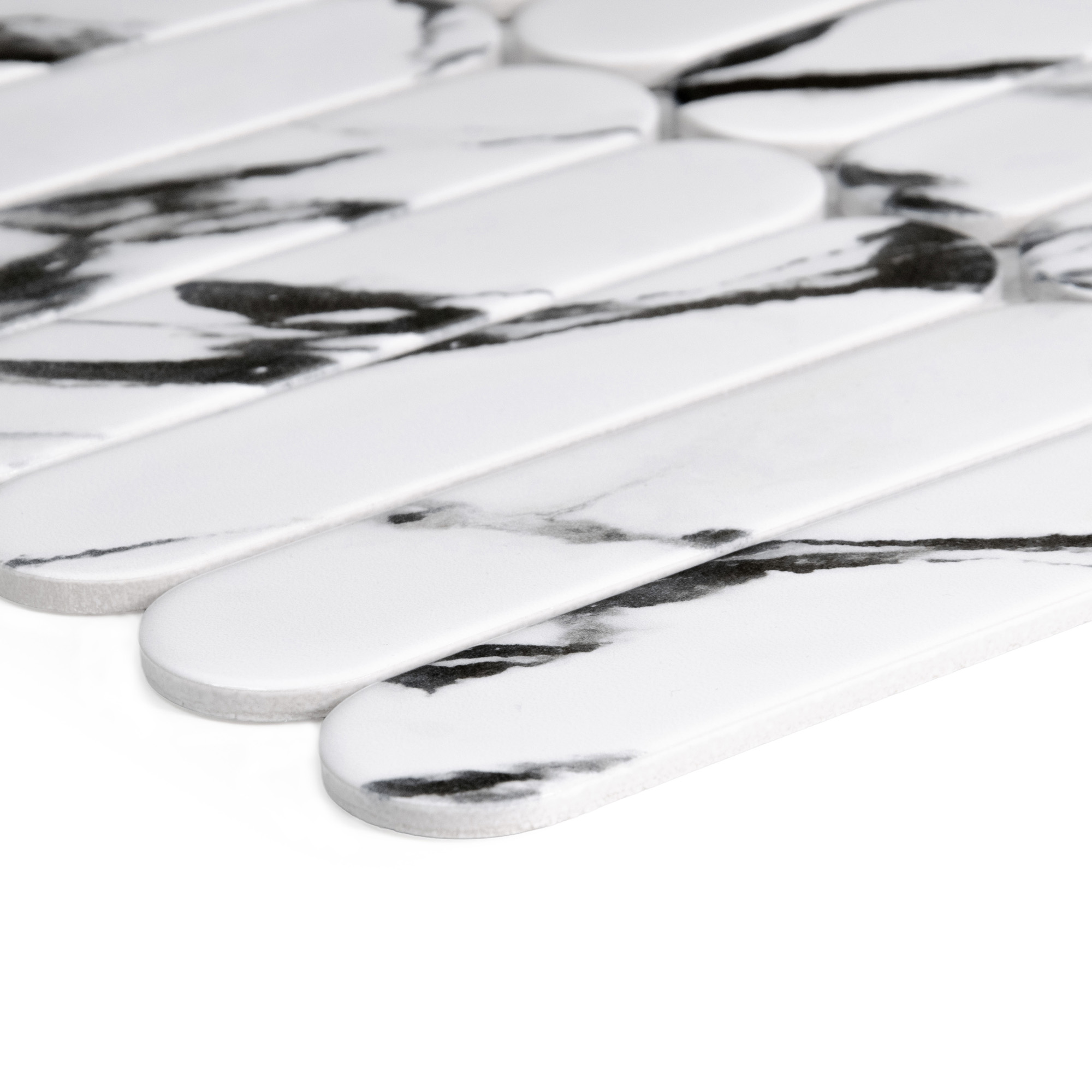 DUNIN Pills Arabescato matt to wybór dla osób, które chcą nadać wnętrzu wyrazisty, designerski charakter. Inspirowane marmurem Arabescato płytki łączą kontrastowe, czarno-szare żyłkowanie z modnym kształtem wydłużonych biszkoptów, tworząc powierzchnię o wyjątkowej głębi i luksusowym wyglądzie. Matowe wykończenie podkreśla elegancję wzoru, jednocześnie łagodząc mocne kontrasty.