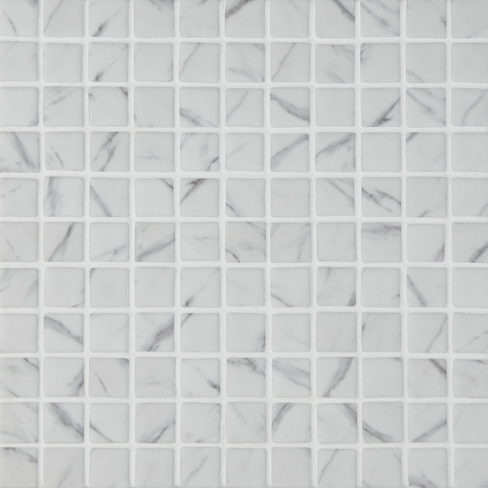 Matowe płytki w kolorze mlecznej bieli, imitujące marmur, wykonane z wysokiej jakości szkła. Wykorzystany materiał sprawia, że kompozycja nie absorbuje wody. Idealne zastosowanie na podłogę i ściany. Mozaika charakteryzuje się łatwym montażem, ze względu na zastosowanie siatki z włókna szklanego.